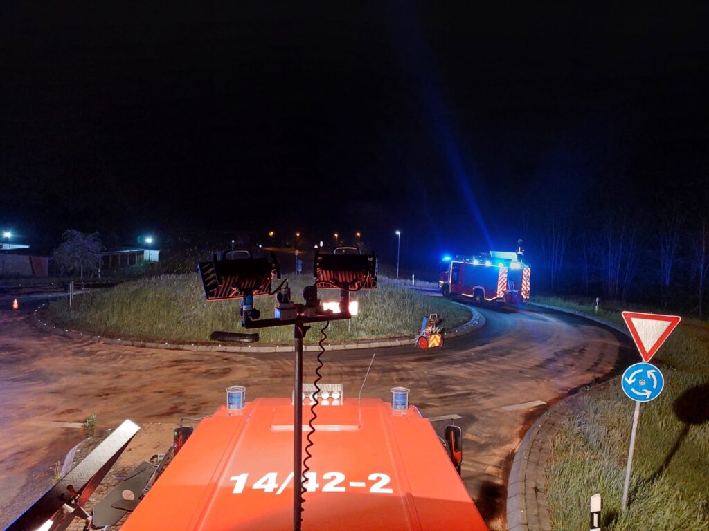 ➡️ Die nächtliche Alarmierung führte uns auf die L30 OV Schenkendorf ->Königs Wusterhausen. Dort verlor ein Transport jede Menge Diesel, der auch intensiv mit der Nase wahrnehmbar war. Es wurde der komplette Kreisverkehr mit Bindemittel abgestreut. Aufgrund der aufgebrauchten Reserven an Bindemittel, musste die Orstwehr Mittenwalde nachalarmiert werden.