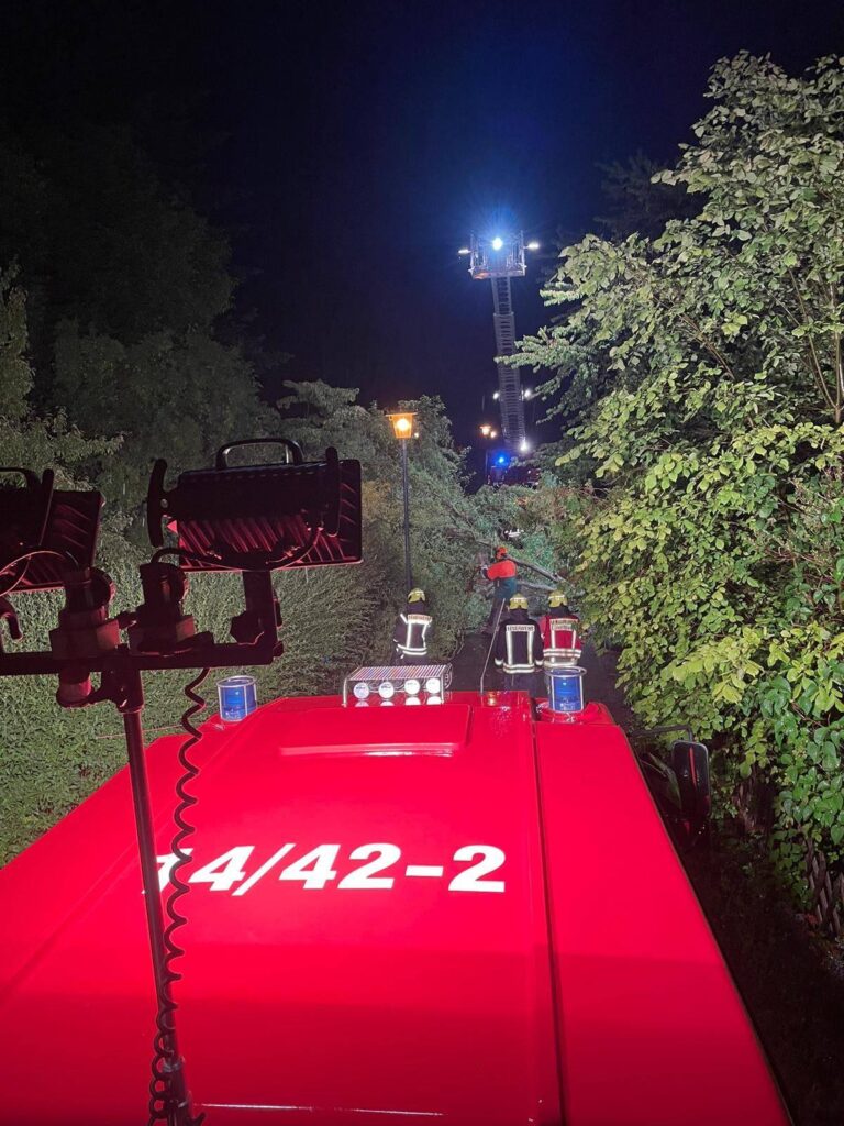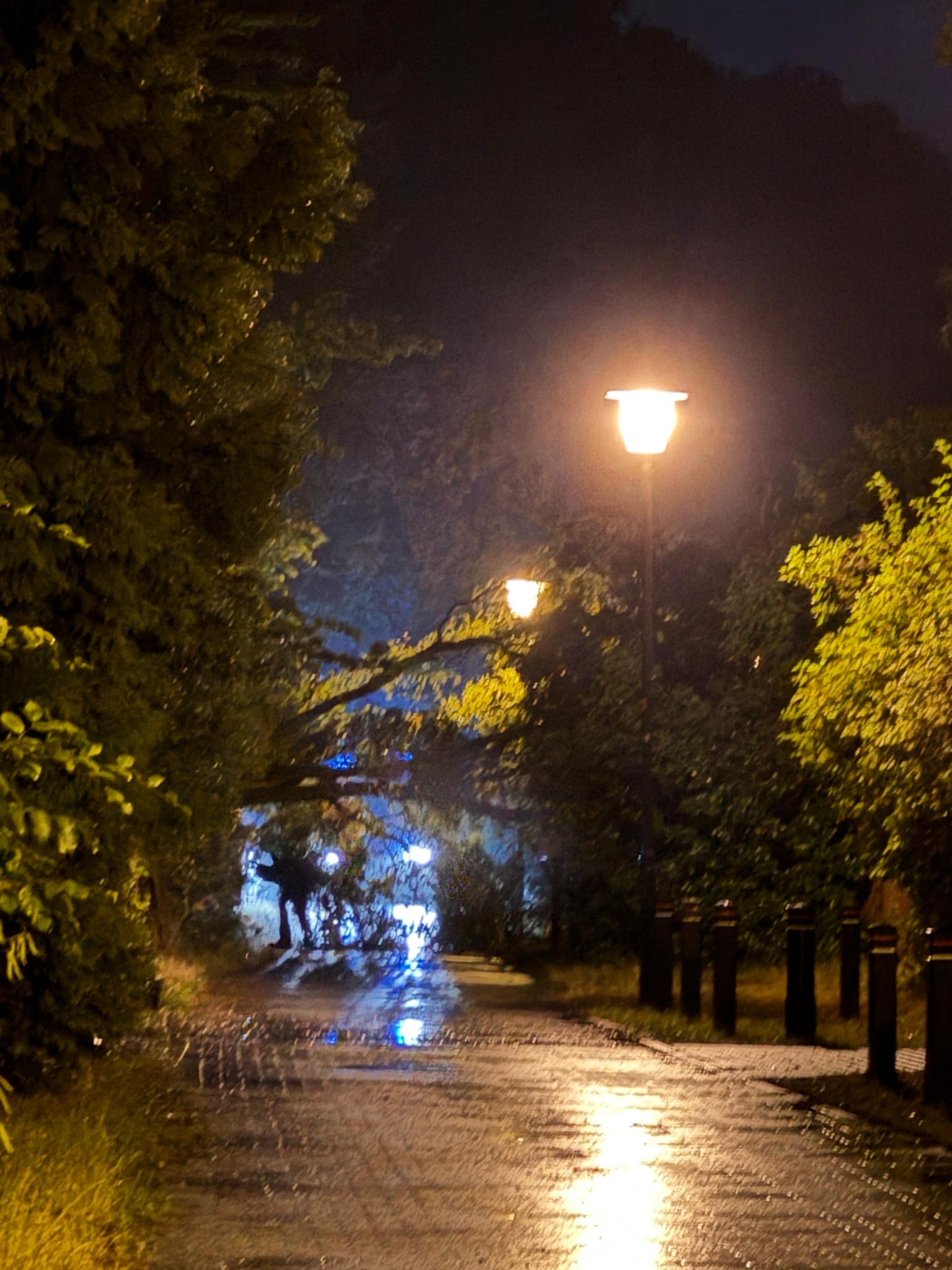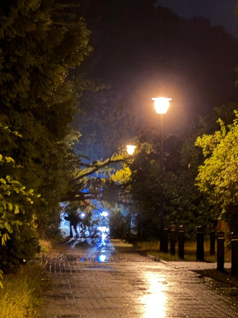 Die nächtliche Alarmierung führte uns nach Schenkendorf. Dort versperrte ein Baum die Durchfahrt. Aufgrund der Höhe des Baumes wurde die Drehleiter aus Mittenwalde dazu gezogen. Gemeinsam wurde der Baum zerkleinert und die Straße grob gereinigt.