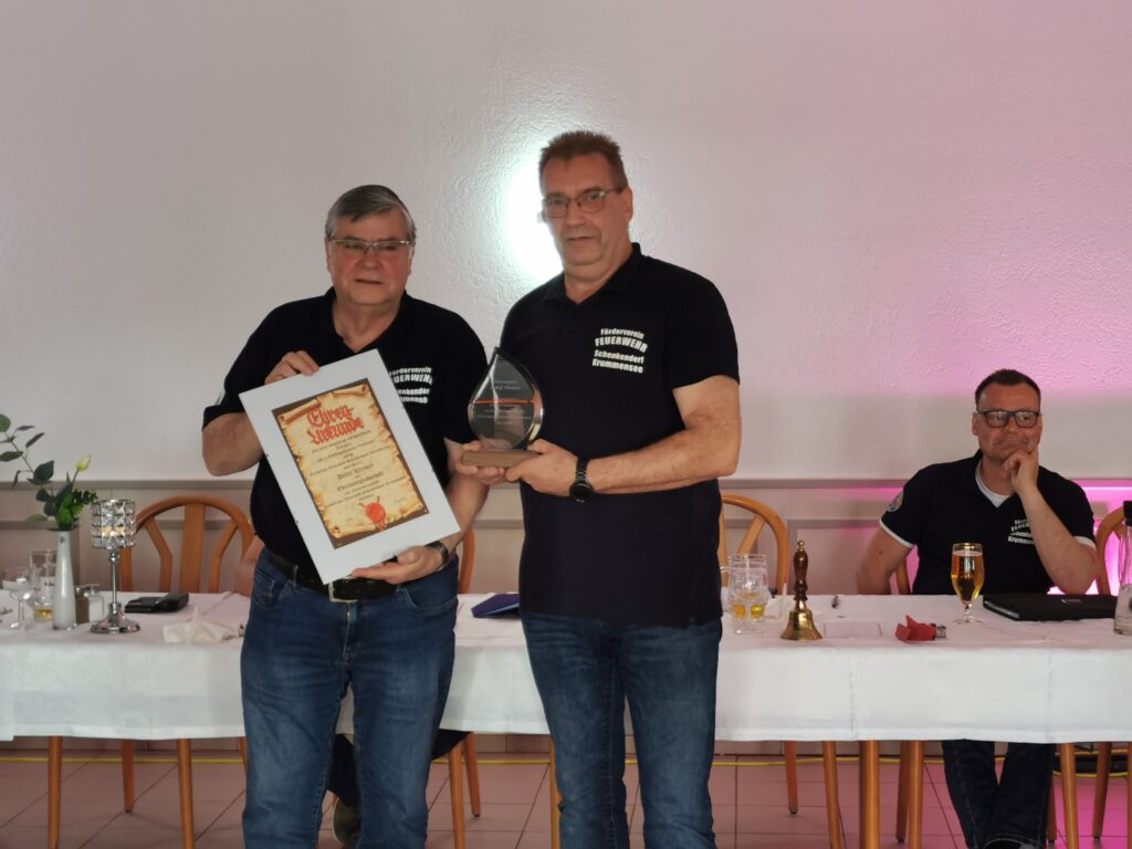 Im Anschluss fand dann die Feierstunde statt, zu der weitere Gäste wie der Ortsbeirat, Feuerwehr, MAG, Sponsoren und Vereinsvertreter eingeladen wurden. Am Ende der Jahreshauptversammlung schlug der Vorstand vor, Detlef nun als Ehrenmitglied aufzunehmen. Dieser Vorschlag wurde von den anwesenden Vereinsmitgliedern einstimmig beschlossen und die Urkunde wurde überreicht.